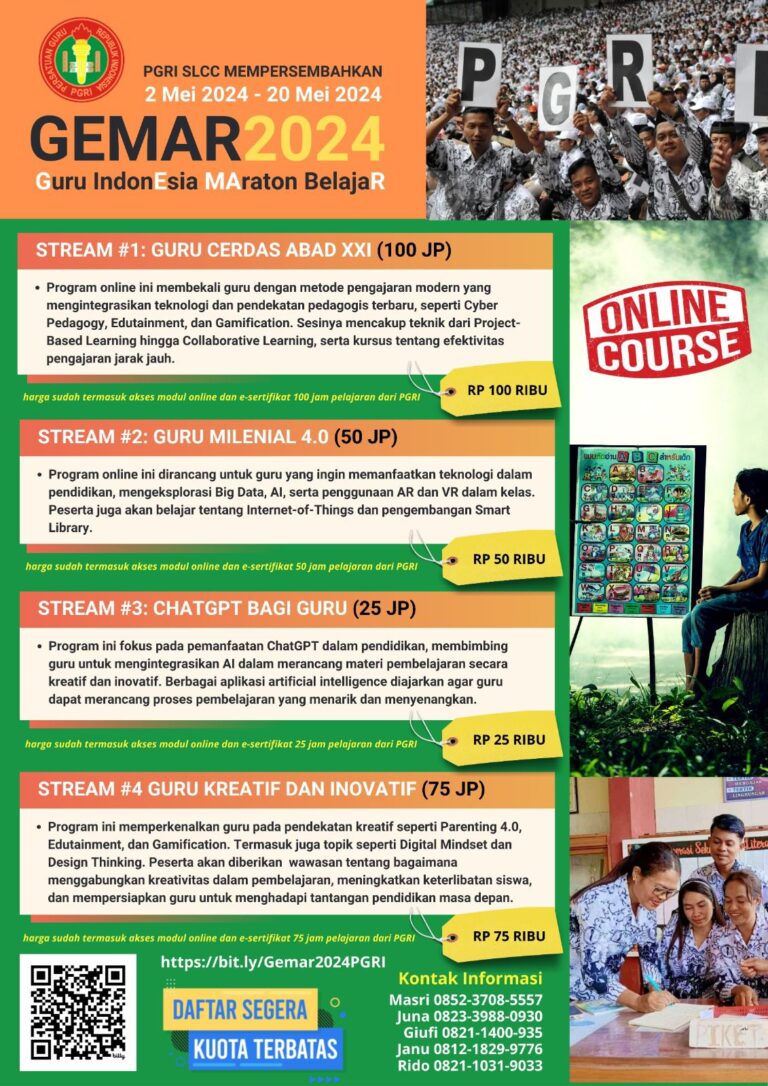 Para Guru Indonesia Yth. Dalam rangka memperingati Hari Pendidikan Nasional dan Hari Kebangkitan Nasional, PGRI SLCC menyelenggarakan program belajar online...